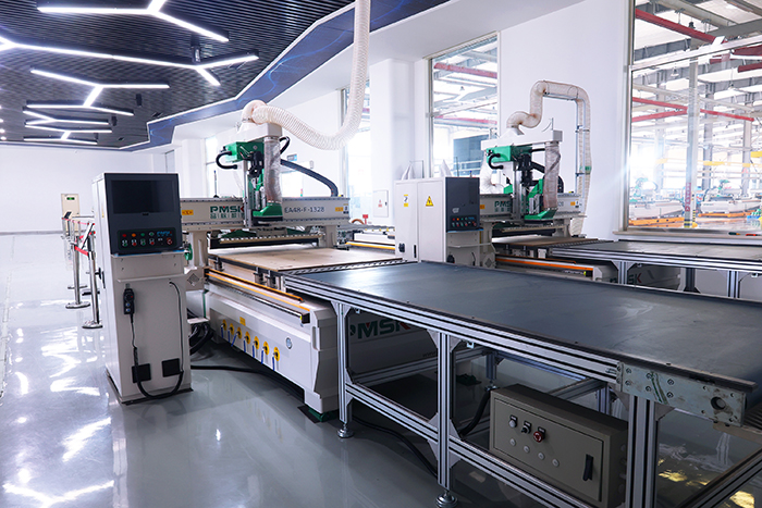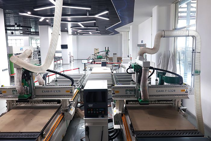 品脈數(shù)控一拖二智能開料單元是一套自動化程度比較高的數(shù)控開料解決方案。開料單元由一臺高速自動貼標機、兩臺全自動數(shù)控開料中心以及動力滾筒線、中控系統(tǒng)組成。人工只需將板材放置在升降機上,由貼標機自動貼標,再由中控系統(tǒng)自動分配至開料中心,完成板材切割工作。如選配機器人系統(tǒng),可由機器人完成碼垛,余料利用及廢料輸出等工作。