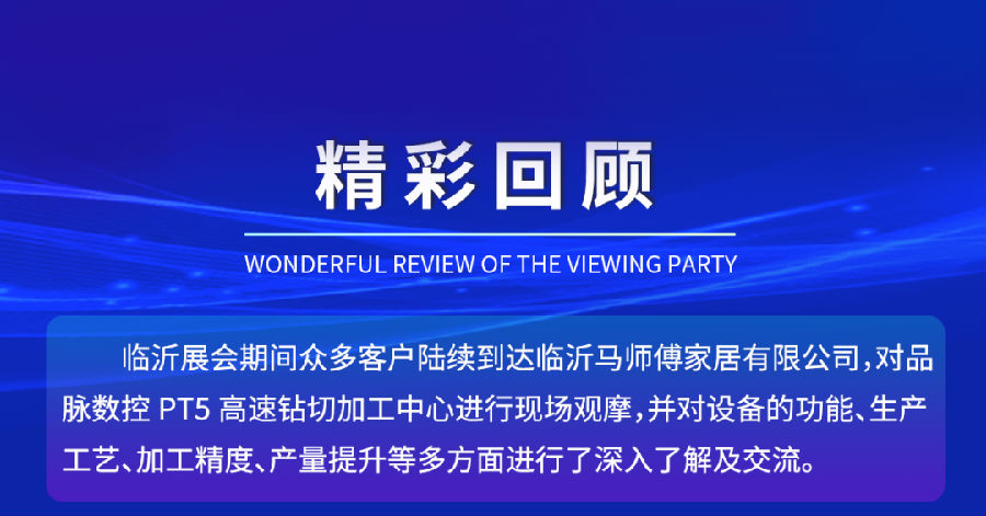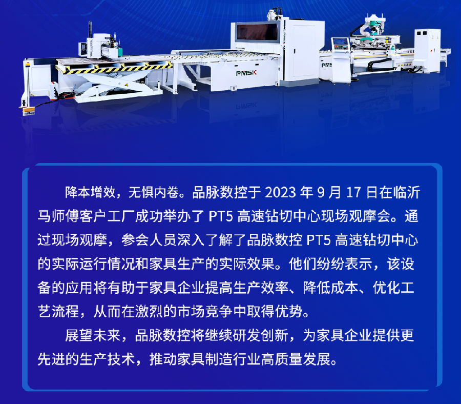 臨沂馬師傅家居有限公司是一家專注于板式家具制造的公司。2023年4月的臨沂展會(huì)期間訂購(gòu)了品脈數(shù)控的PT5高速鉆切中心。此前,馬師傅工廠使用著開料機(jī)、封邊機(jī)和側(cè)孔機(jī)進(jìn)行生產(chǎn),每天的產(chǎn)能只有40張板。然而,伴隨著訂單量的增加,工廠的產(chǎn)能遠(yuǎn)遠(yuǎn)達(dá)不到生產(chǎn)需求。為了解決這個(gè)問題,馬總決定擴(kuò)充更新設(shè)備。馬總偶然間看到了我們的PT5高速鉆切中心的加工視頻,并對(duì)其加工模式產(chǎn)生了濃厚的興趣。于是,馬師傅在今年四月份前往臨沂展會(huì),通過詳細(xì)了解PT5的生產(chǎn)模式和設(shè)備優(yōu)勢(shì)之后,決定訂購(gòu)該臺(tái)設(shè)備。該設(shè)備于五月份正式投產(chǎn)使用。投產(chǎn)后,馬師傅工廠的日產(chǎn)能從原先的40張板增加到了現(xiàn)在的140張板,產(chǎn)能提高了3倍多。并且PT5整臺(tái)設(shè)備只需要一個(gè)人工便能夠輕松操作,大大降低了人工成本、生產(chǎn)成本,實(shí)現(xiàn)了效率翻倍。